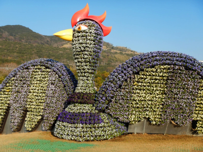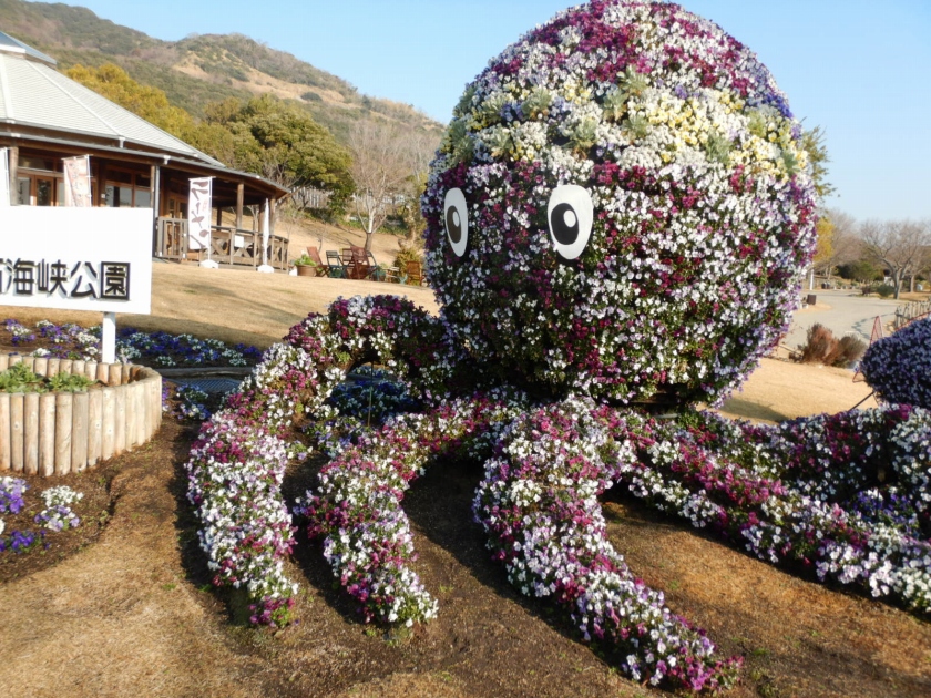 写真一枚目:立体花壇「花火鳥」、二枚目:立体花壇「タコトピアリー」