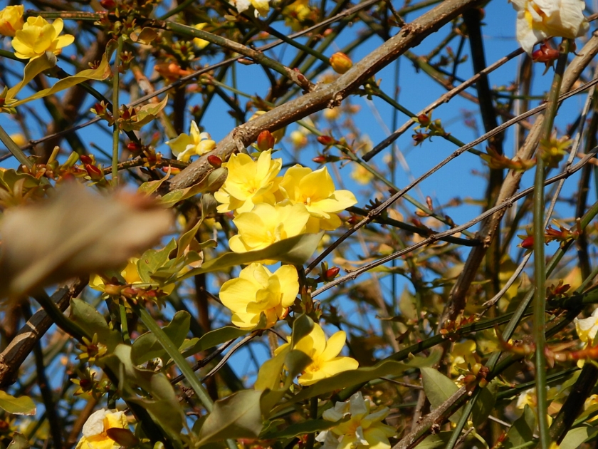 鮮やかな黄色の花が青空に映えます。開花は日に日に増えているのですが、今年は花の丘道沿いにメジロ、ヒヨドリ、ムクドリなどの鳥が非常に多くたむろしており、咲いた花をついばまれてしまっています。