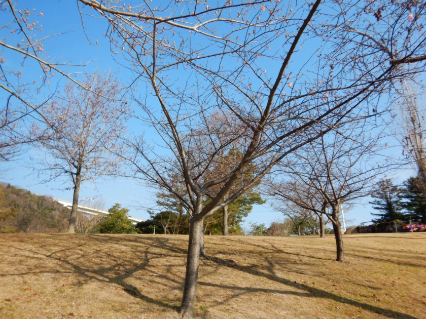 例年ですと2月末に見ごろを迎える河津桜。今年もそのくらいではと予想しますが、月のテラス横ではフライング気味のお花がチラホラ。春一番の丘の桜のつぼみはまだ硬く締まっています。