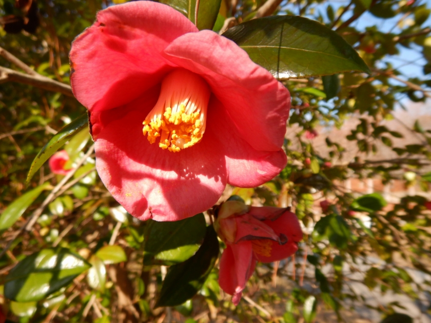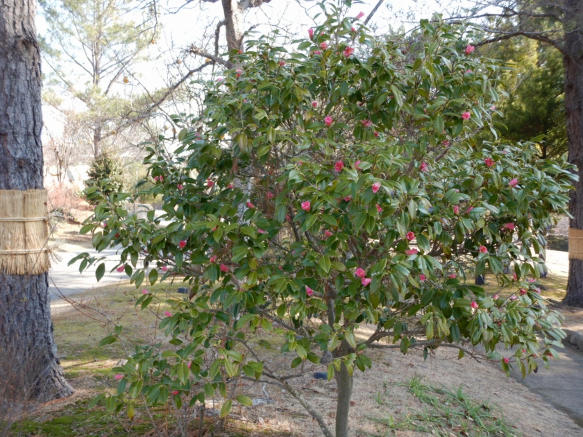 花の谷と松の谷の間の園路沿いにはヤブツバキ、ワビスケが何本か開花しています。ボート乗り場そばなどではカンツバキが咲いています。まだ開花していない木も複数あるため、ツバキは細々と長く観賞できそうです。