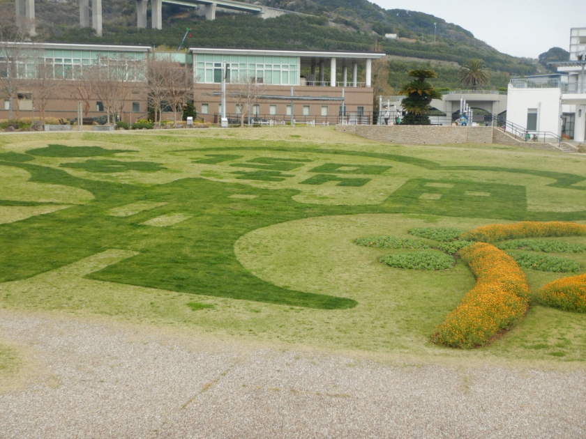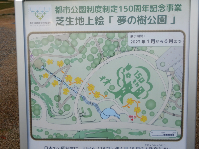 この1月15日で都市公園制度が制定されて150周年。それを芝生の絵で表してみました。見やすいように観覧お立ち台を設置しましたので、上ってみてください。「もっとはっきり見たい!」という場合は、ビジター棟の屋上からご覧ください。