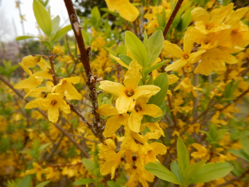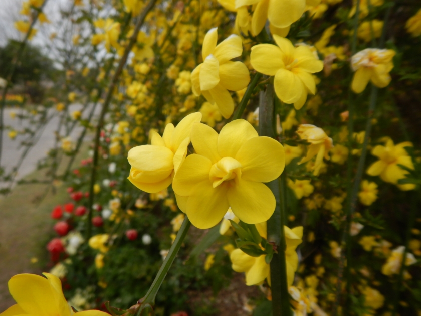 冬から咲いていたウンナンオウバイの花数が増えてきました。まばゆい黄色がチューリップとマッチ!