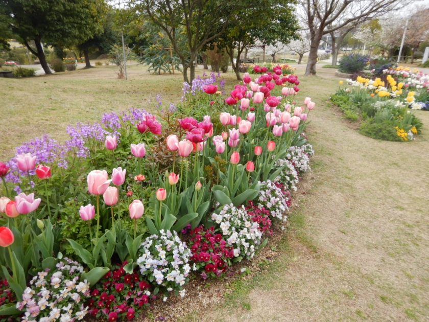 当公園ではチューリップを長い期間楽しんでいただく工夫として、一つの花壇の中に早生・中生・晩生を取り交ぜて植えています。早く咲いたものが散ってしまっても、その後からまた別の品種が咲くといった感じです。極端に言うと見ごろの期間の最初(3月後半)と最後(4月上中旬)では、咲いている品種がガラッと入れ替わっているのです。