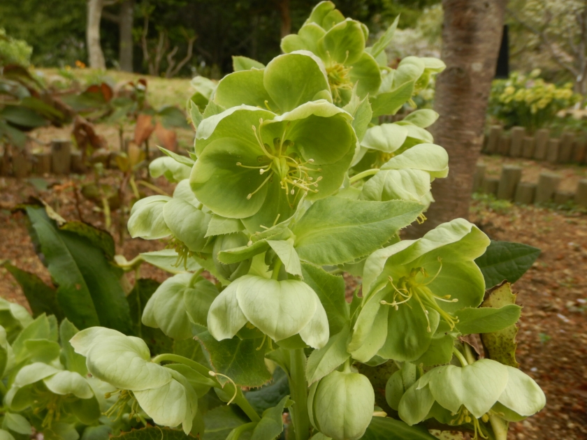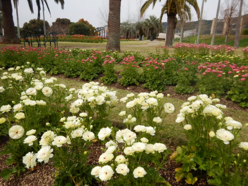 花びらがツヤツヤテカテカのラナンキュラス‘ラックス’が次々咲き始めています。量的にはパームガーデンが多いですが、海のテラスなどでもきれいに咲いています。花の丘道は今ならチューリップやクリスマスローズと一緒に楽しめます。