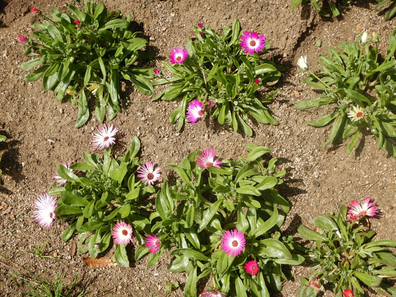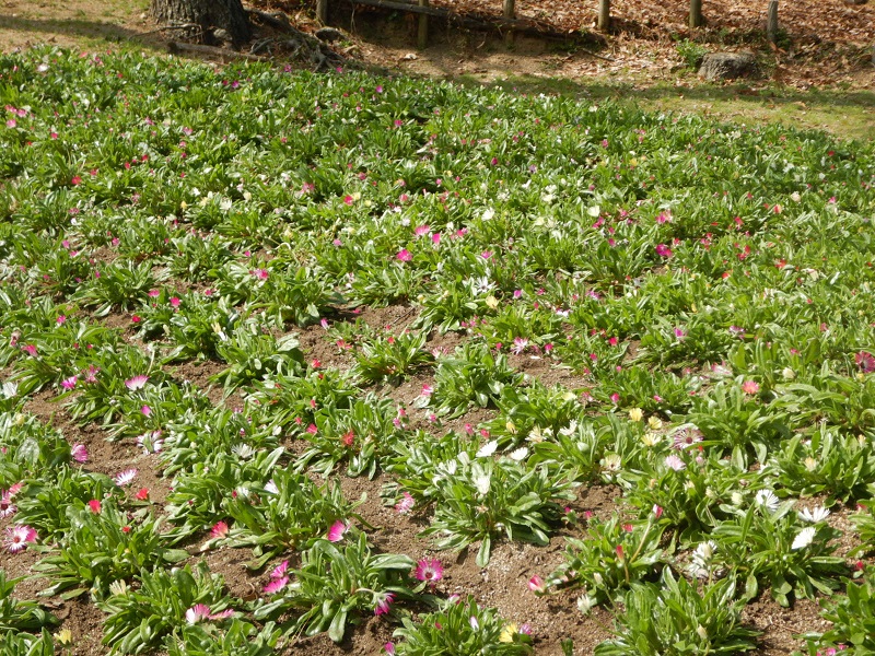 太陽の光を浴びると開くリビングストンデージーの花。見ごろになるのは4月半ばくらいだと思いますが、晴れだった日には花が開いてキラキラしてました。今日は午前中曇りだったので微妙(午後1時撮影)。晴れた日にご来園の際には、咲いているか確かめてみてください。