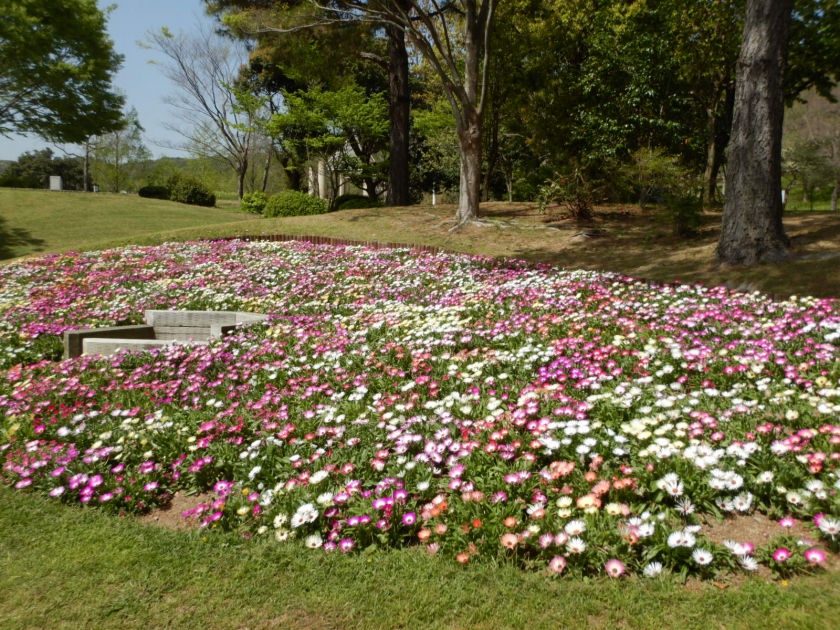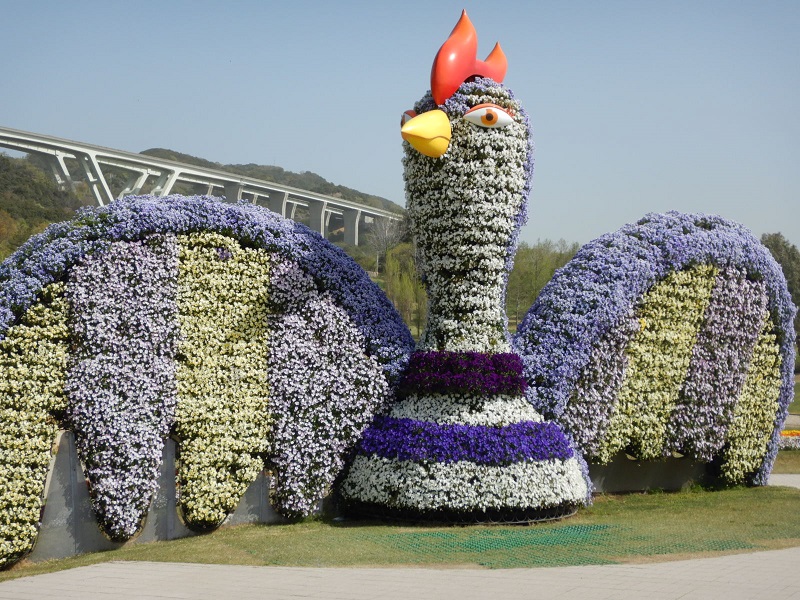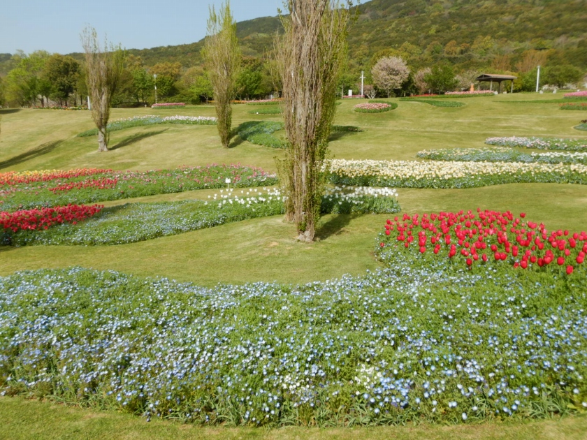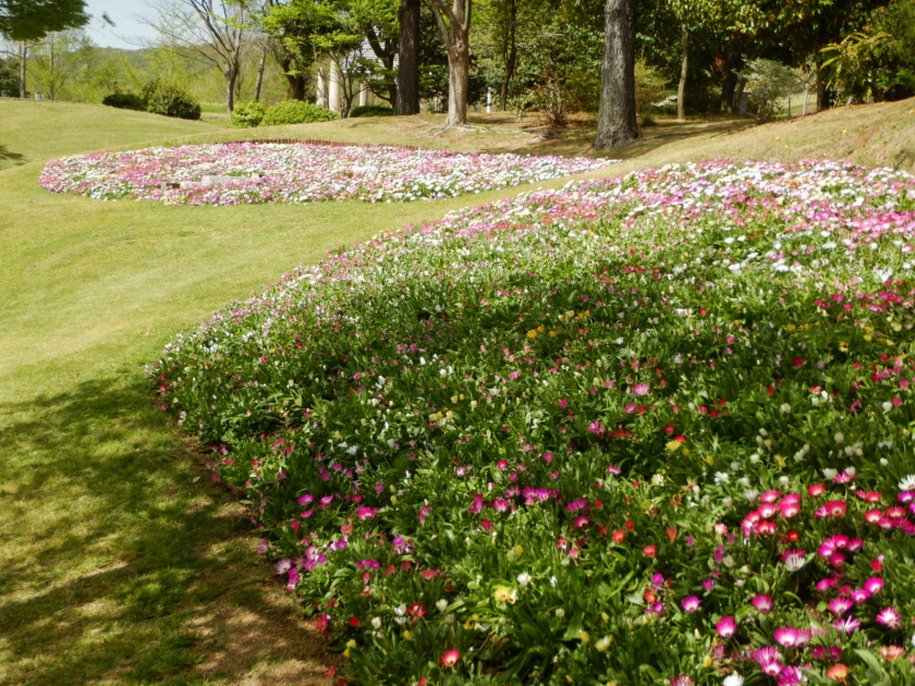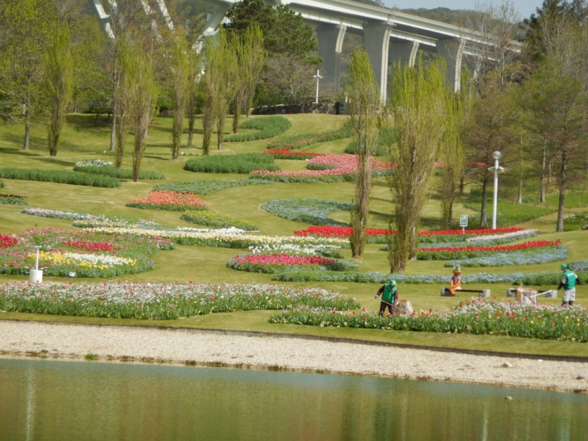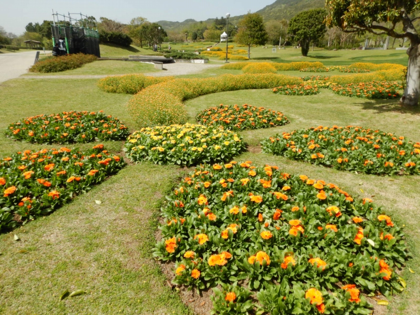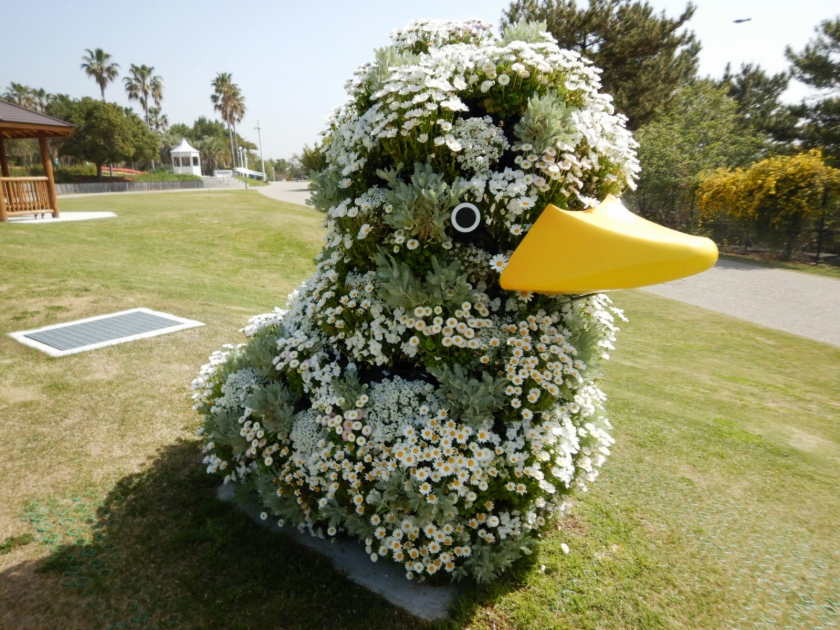 ビオラが主体の立体花壇。一番大きい「花火鳥」は高さ4メートル、幅30メートル。ここまで立派な常設の立体花壇は日本では多分ここ以外にありませんので、是非ご覧下さい。他のもかわいいですよ。タコと鯛は、もうすぐお色直しに入るため、今回はご紹介しません。