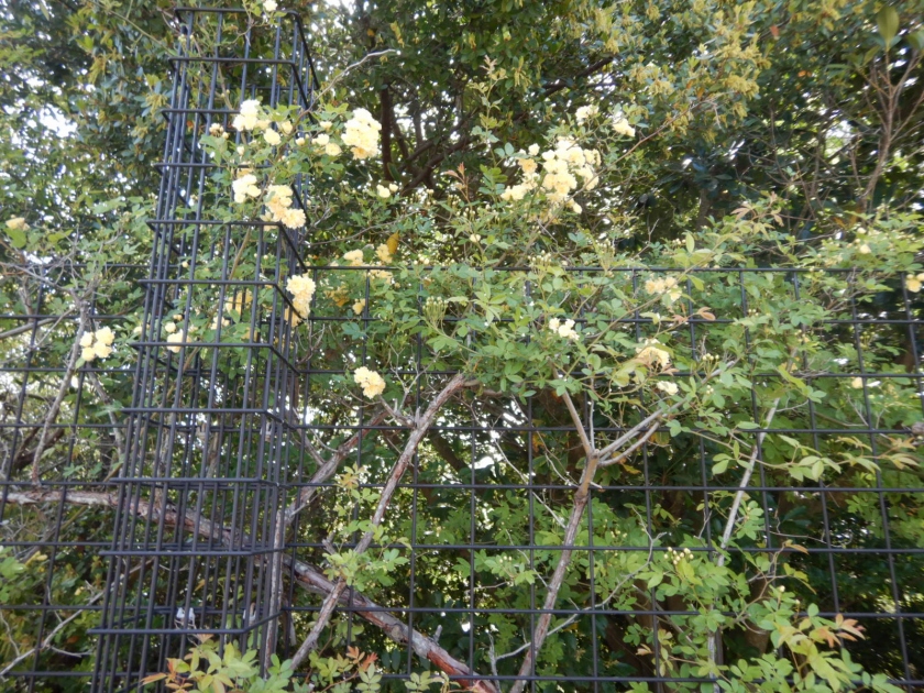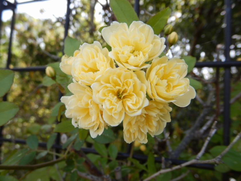 柔らかい黄色の小さいフリフリのお花が、フェンスをポツポツ飾り始めました。カロライナジャスミンと混ざって咲いている部分もあります。