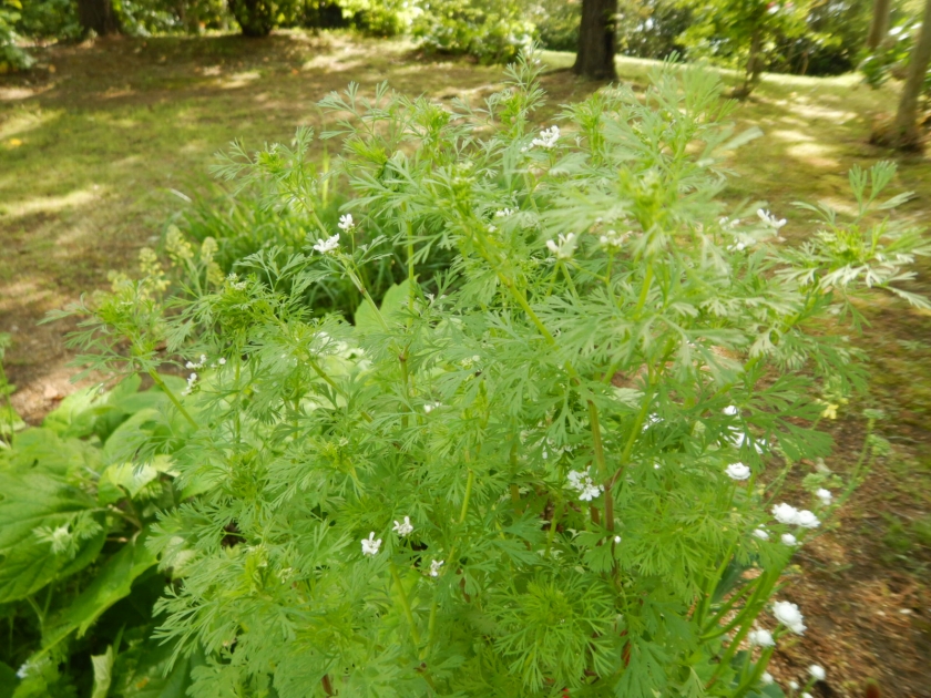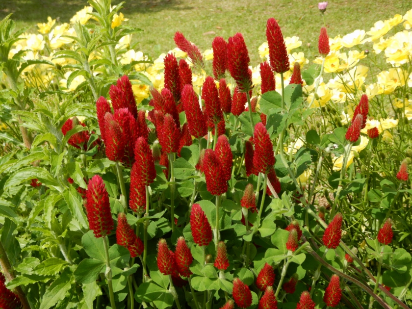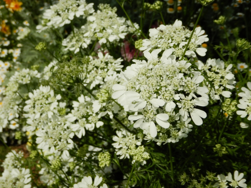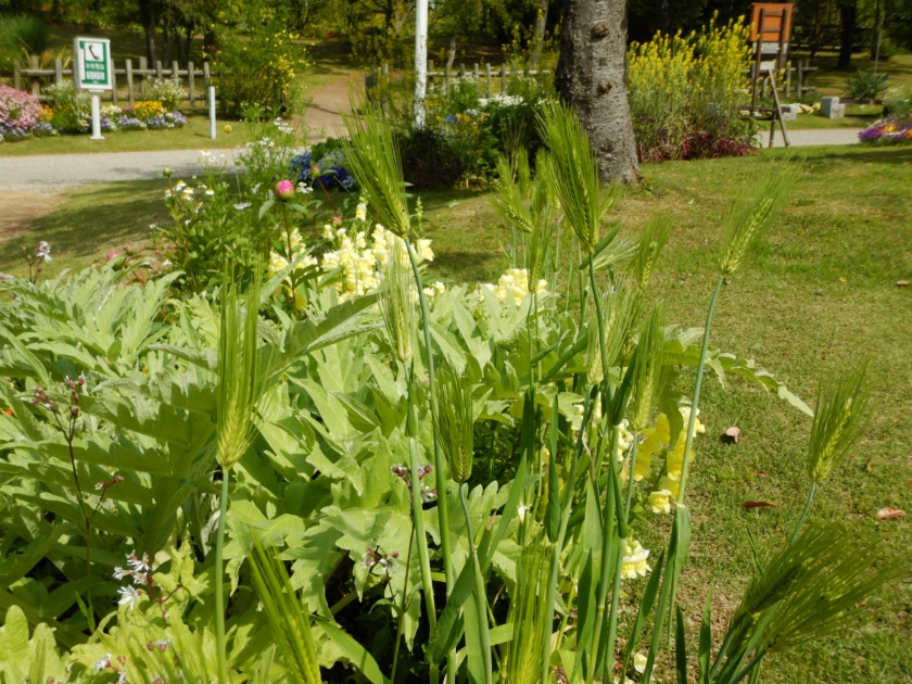 写真一枚目より、クリムゾンクローバー、アンモビューム、ブロッコリーの菜の花、コリアンダー(パクチー)、オルレア、麦、フレンチラベンダー、シロバナムシヨケギク(除虫菊)。花の丘道は現在ハーブ類で華やかです。