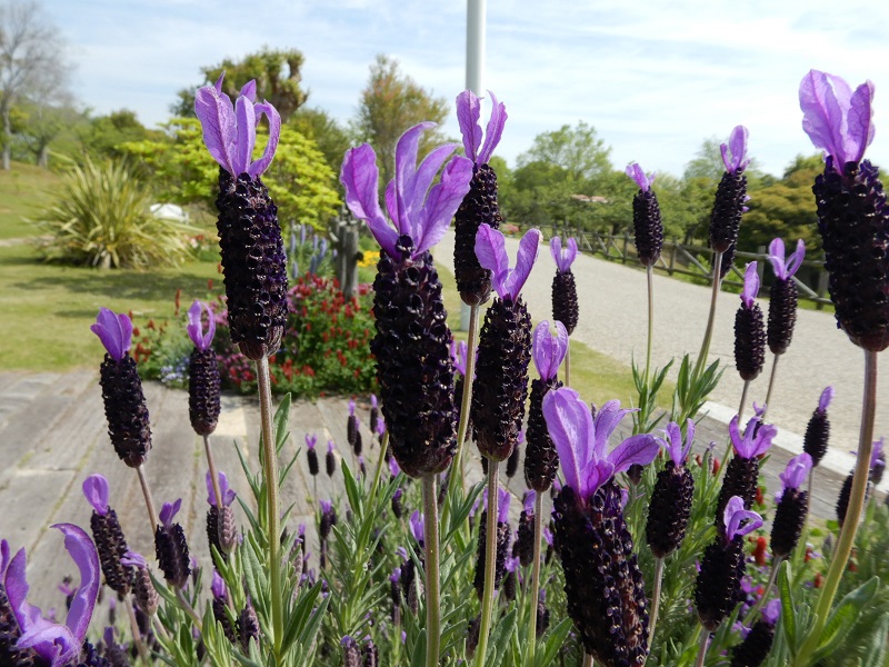 写真は海のテラスです。紫色のこん棒みたいなものがニョキニョキ咲いています。アップで見ると透明感があってきれいな青い花です。去年チョコチョコ植えたため、いろんな場所でニョキニョキしてます。