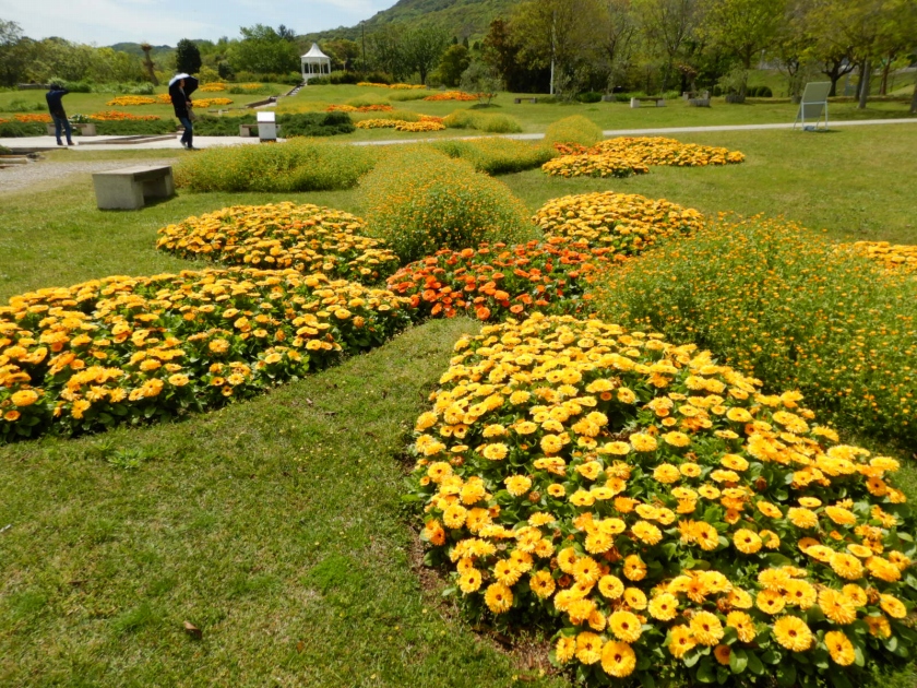 お花の形の花壇がキンセンカで埋まって、クッキリハッキリしていますよ。