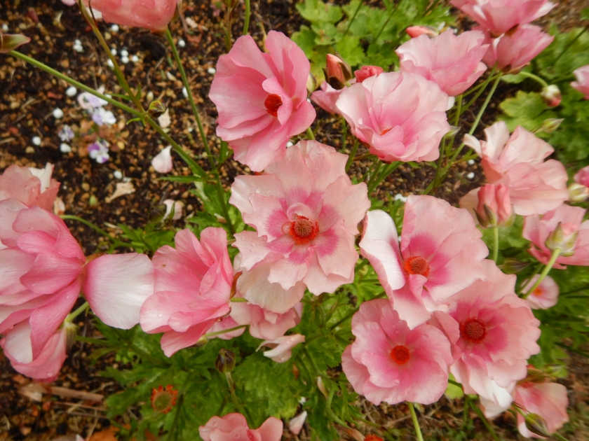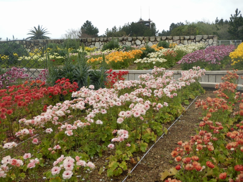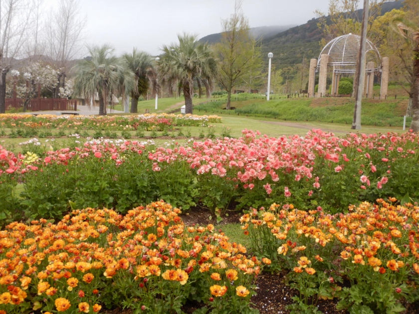 花びらがツヤツヤテカテカのラナンキュラス‘ラックス’が次々咲いています。量的にはパームガーデンが多いですが、海のテラスなどでもきれいに咲いています。花の丘道は今ならチューリップやクリスマスローズと一緒に楽しめます。