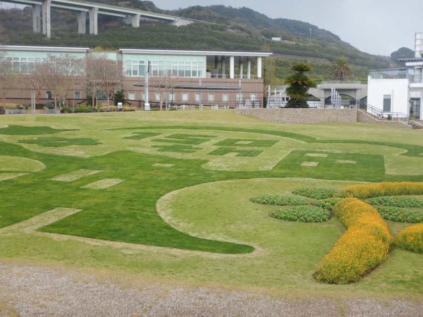 この1月15日で都市公園制度が制定されて150周年。それを芝生の絵で表してみました。見やすいように観覧お立ち台を設置しましたので、上ってみてください。「もっとはっきり見たい!」という場合は、ビジター棟の屋上からご覧ください。