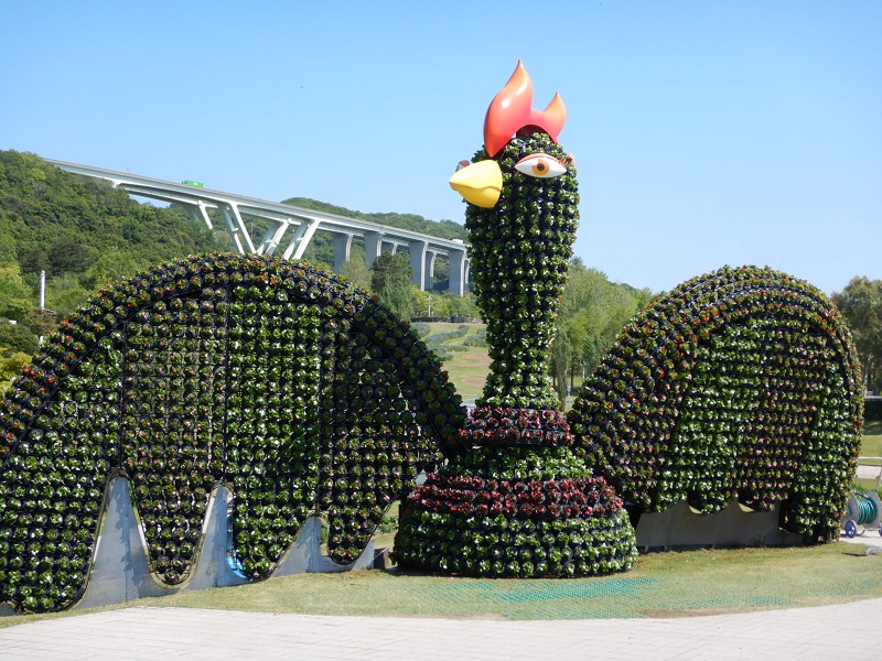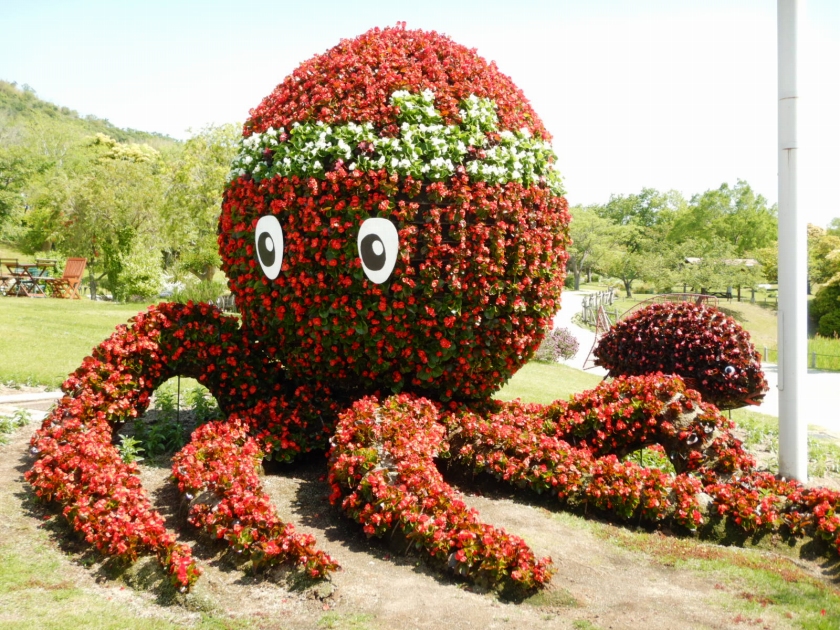 大地の虹にある立体花壇「花火鳥」は植替えホヤホヤですが、東浦口ゲート前の「タコトピアリー」は植え替えてからいい具合に成長し、茹でダコっぽいきれいな赤になっています。