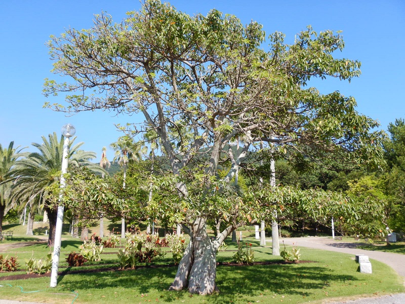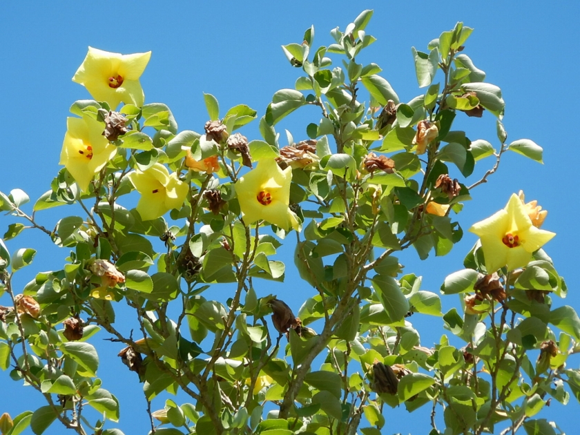 朝に開花して夕方にはしぼんで終わりの一日花。2メートル超の木に咲いていますが、花の見た目はオクラの花にそっくり。開花期間が短いので、ご覧になりたい方はお早めに。
