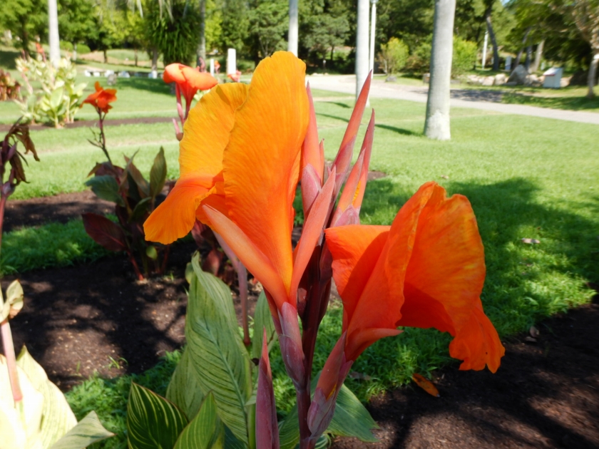 背の高いヤシの木がそびえるパームガーデン。夏っぽいヤシの足元で夏っぽいオレンジの花。夏です。