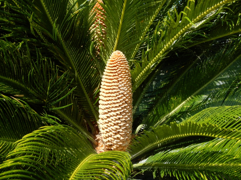 この時期の新聞記事に「珍しく開花」などと載ったりしているソテツの花。当公園では特段珍しくもなく毎年咲いています。ただ、園内には雌花が咲く木が少ないらしく、容易に目に入るのはホッソリ雄花の方だと思います。