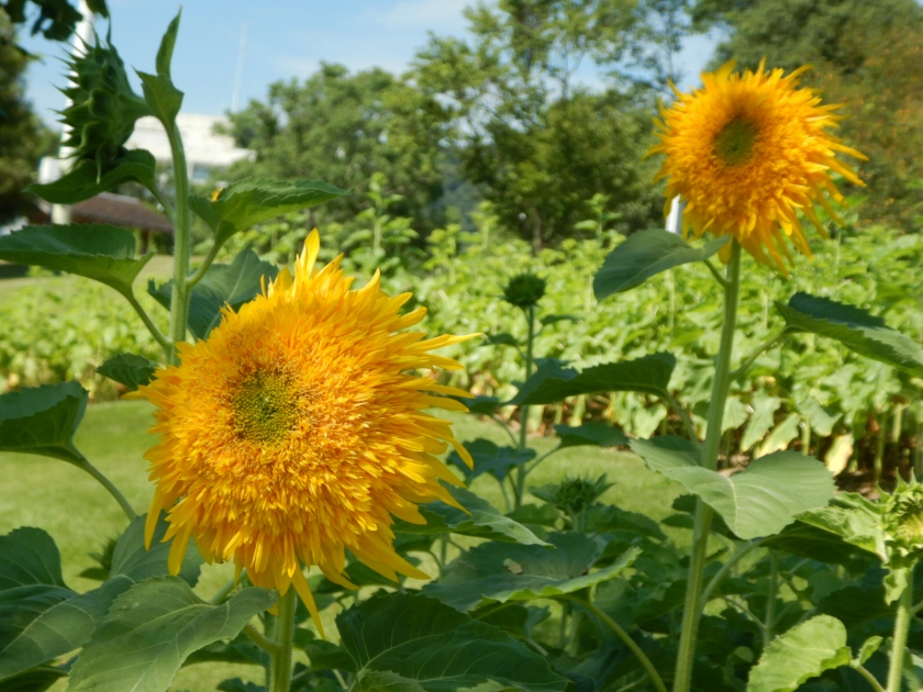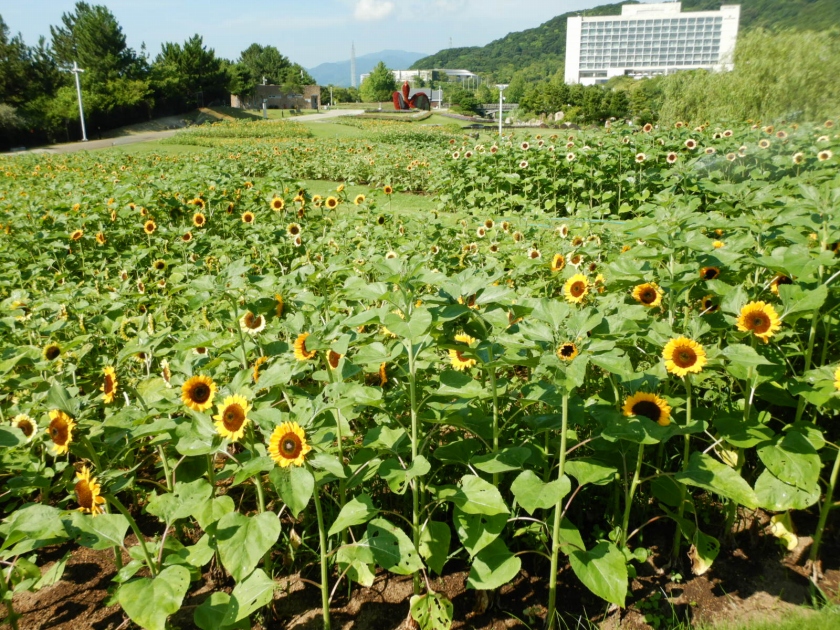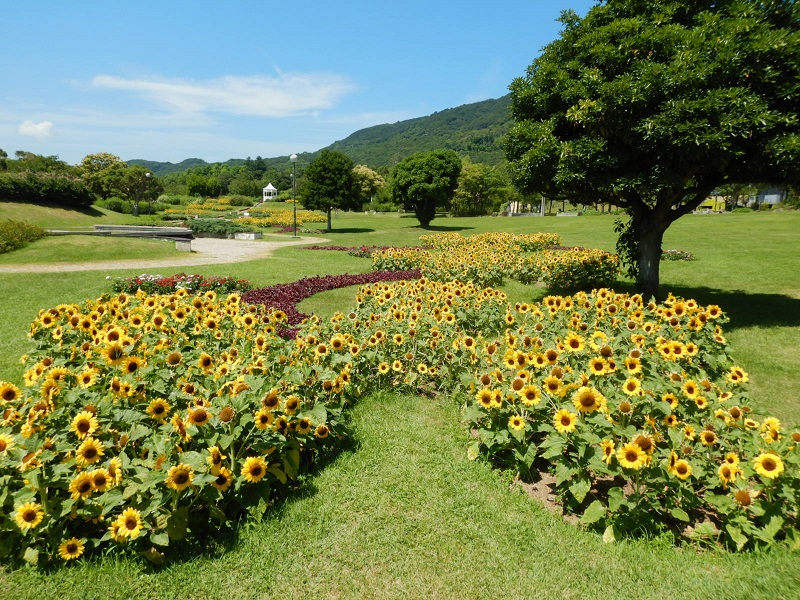 大地の虹北花壇とポプラの丘のヒマワリが見ごろとなりました。夏らしさ満載です。一足先に見ごろとなっている移ろいの庭のヒマワリは、高さが低いヒマワリなので、お子様やワンちゃんと一緒の撮影で大人気です。