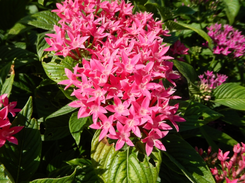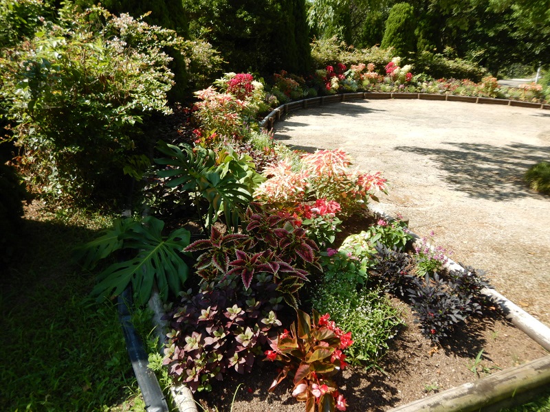 夏はカラフルな葉っぱを楽しむ植物が出回ります。半円形花壇にいろいろ植えましたので、お近くで違いをご覧ください。