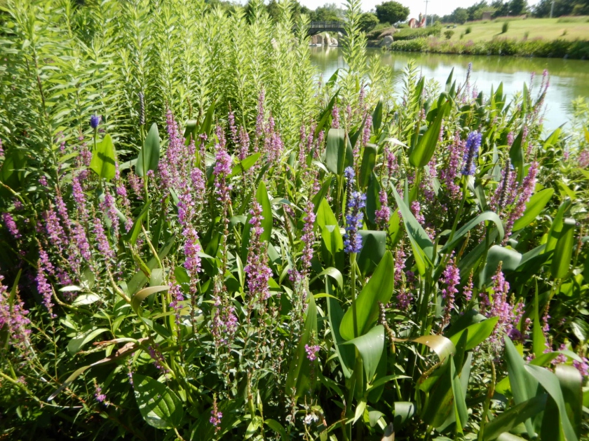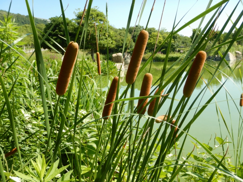 中海周りがミソハギでホワッとピンク色に囲まれています。その合間にチョコッと見える青い色の花がポンテデリア。アメリカンドッグに似たガマは濃茶と薄茶の2品種あり、手触りはビロードのような滑らかさです。