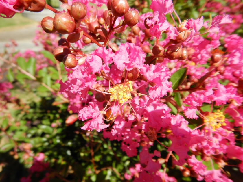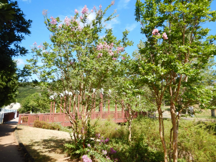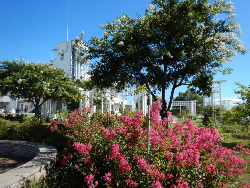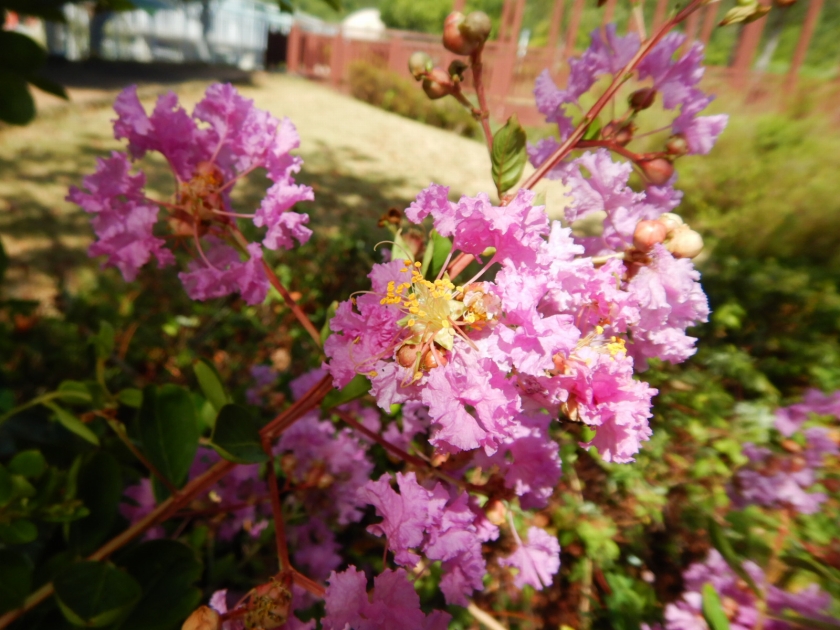 園内にはサルスベリ、シマサルスベリ、イッサイサルスベリが植わっており、それらが咲き始めました。白、赤、濃桃、ピンクなどなど、ちょっとずつあります。