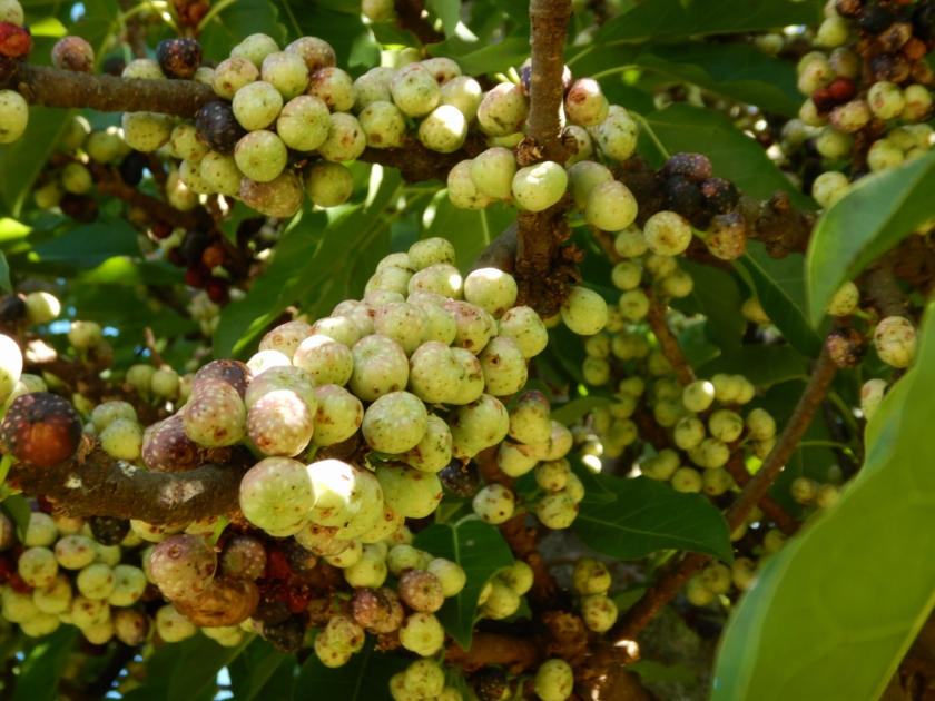 大きくそびえ立つアコウの木。枝や幹に1㎝くらいのブツブツツブツブの実が気持ち悪いくらいビッシリ。見たことがない人に是非見てほしい、ある意味おススメの木です。