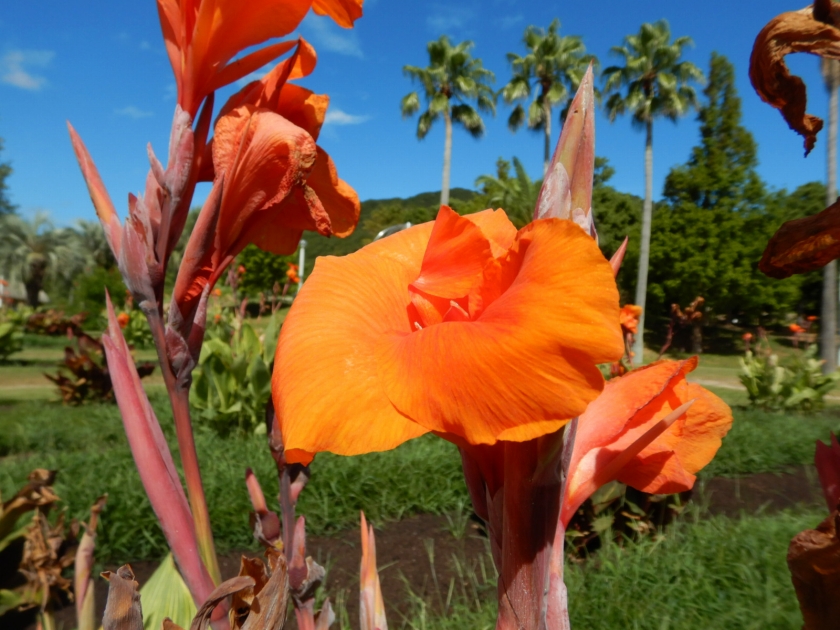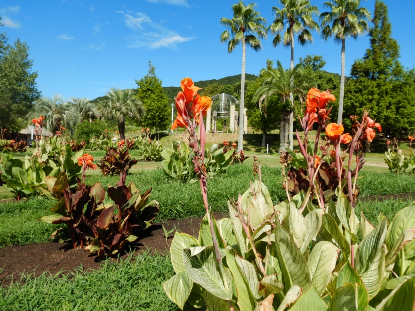 背の高いヤシの木がそびえるパームガーデン。夏っぽいヤシの足元で夏っぽいオレンジの花。夏です。