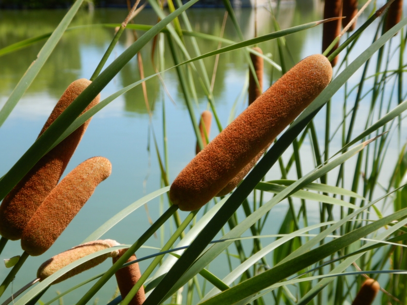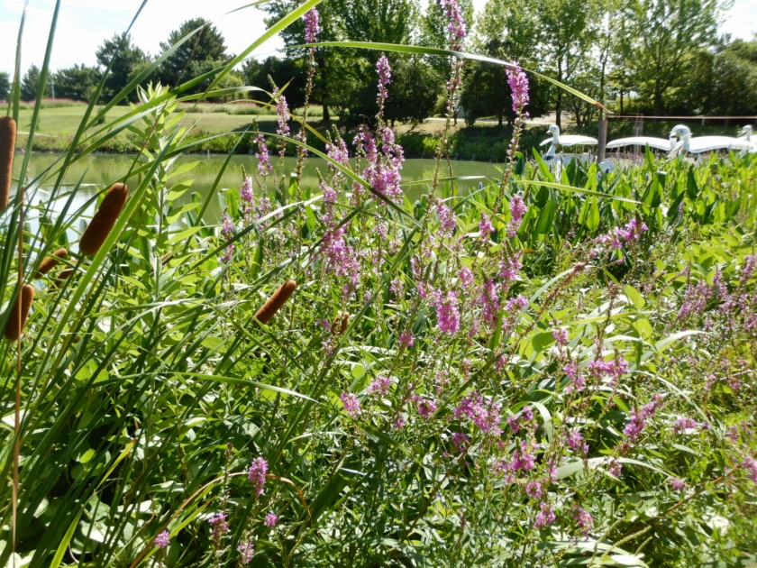 中海周りには水辺が好きな植物たちが植わっています。ピンク色のお花がミソハギ、青色がポンテデリア、茶色のアメリカンドッグ状のものがガマです。