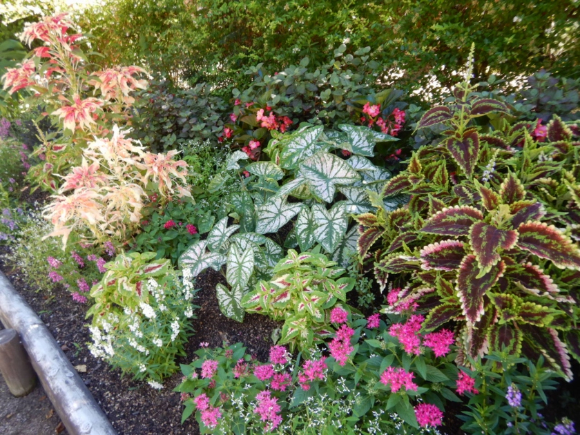 夏はカラフルな葉っぱを楽しむ植物が出回ります。半円形花壇にいろいろ植えましたので、お近くで見比べてみてください。