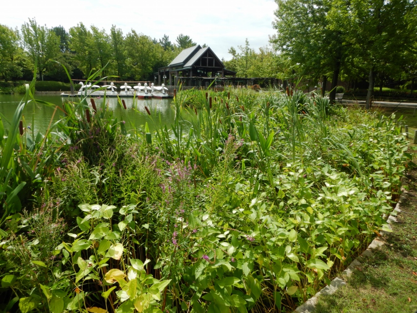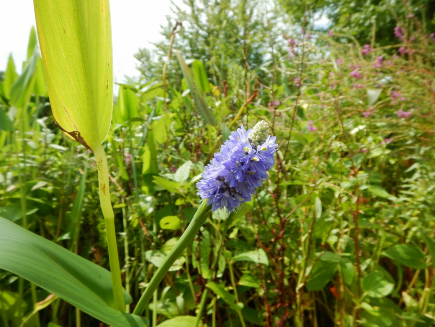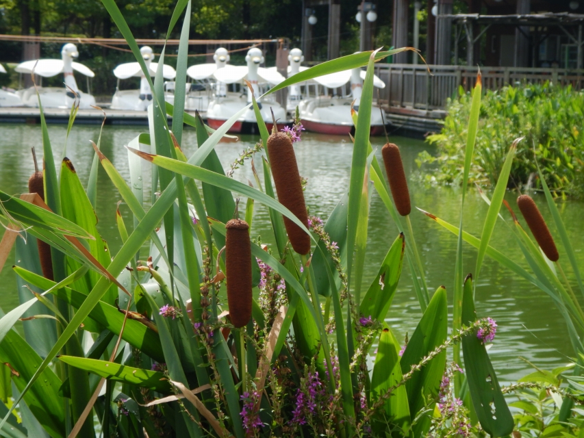 中海周りには水辺が好きな植物たちが植わっています。ピンク色のお花がミソハギ、青色がポンテデリア、茶色のアメリカンドッグ状のものがガマです。