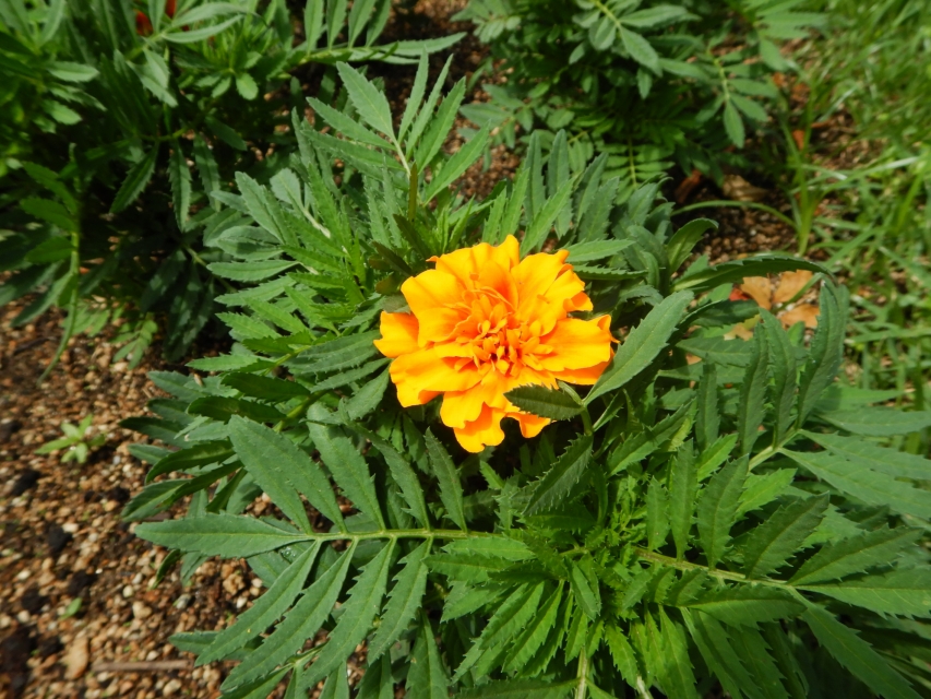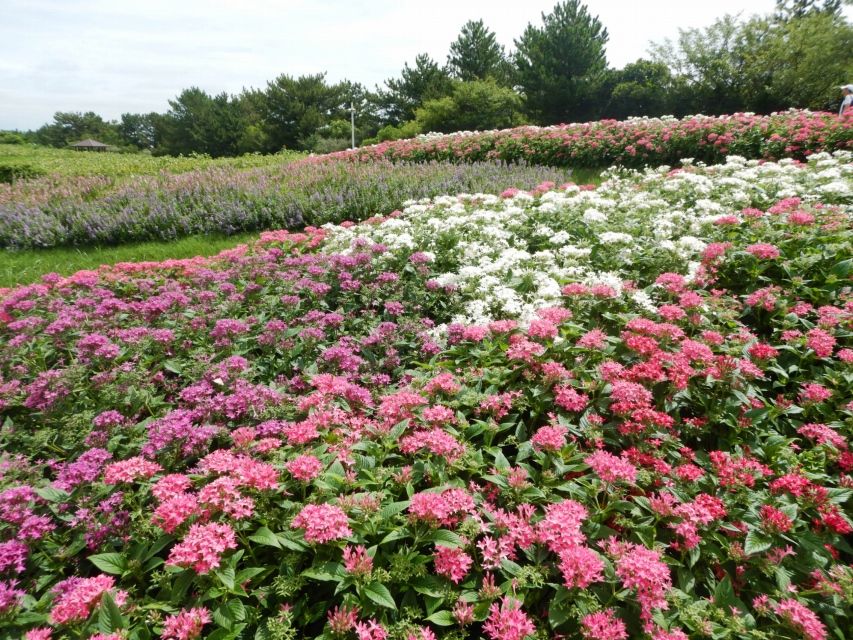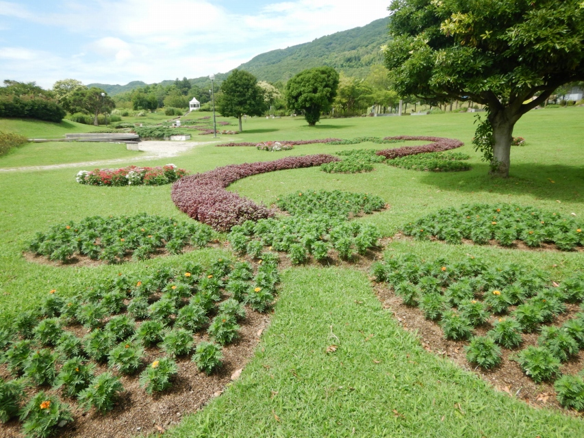 花形の花壇でマリーゴールドが咲き始めました。これから橙や黄・赤色の秋らしい花色のお花畑になります。周囲ではペンタスとアルテルナンテラ(赤葉千日紅)もご覧いただけます。