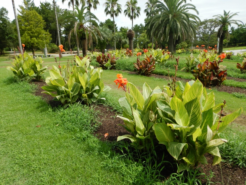 背の高いヤシの木がそびえるパームガーデン。夏っぽいヤシの足元で夏っぽいオレンジの花。夏です。