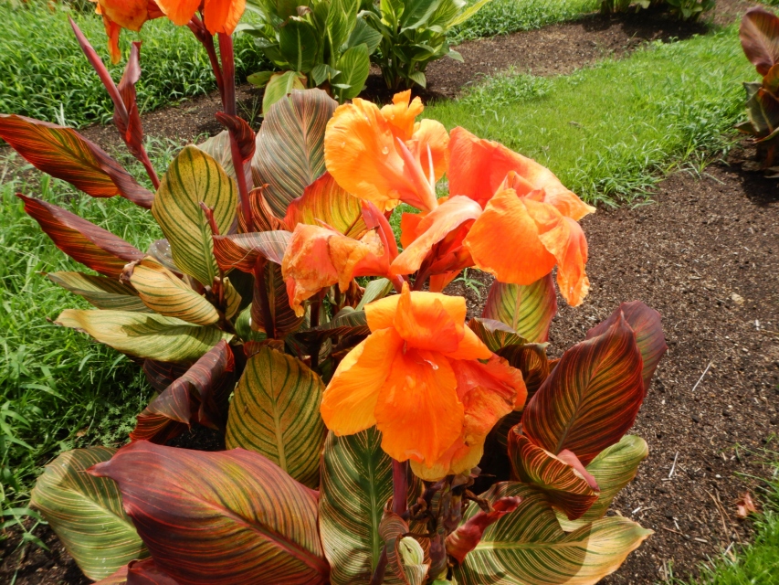 夏はカラフルな葉っぱを楽しむ植物が出回ります。半円形花壇にいろいろ植えましたので、お近くで見比べてみてください。