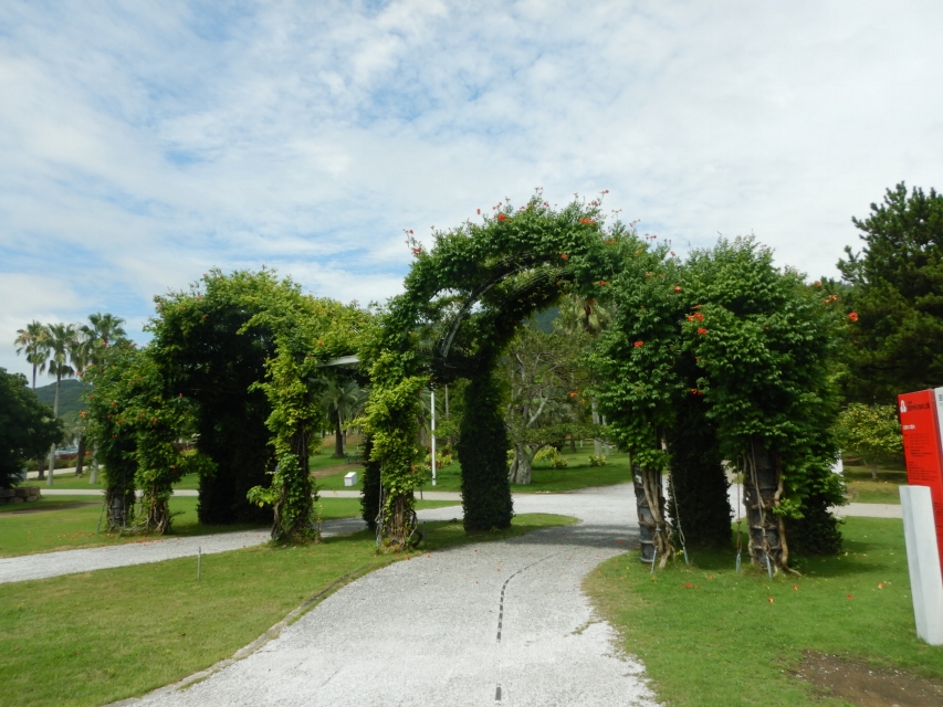 海のテラスのアーチや芝生広場周辺のフェンスに絡みついているノウゼンカズラ。ひとつひとつの花の寿命が短いため、日によって数輪しか咲いていない日も。