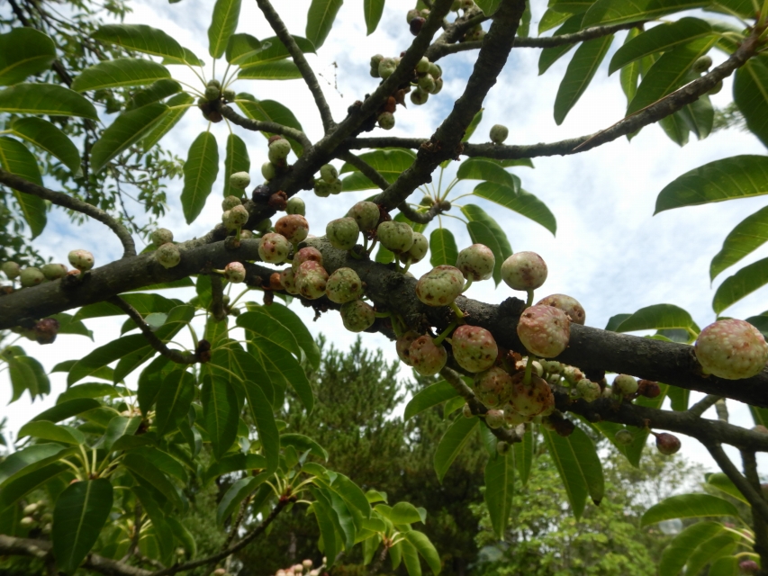 大きくそびえ立つアコウの木。枝や幹に1㎝くらいのブツブツツブツブの実が気持ち悪いくらいビッシリ。見たことがない人に是非見てほしい、ある意味おススメの木です。