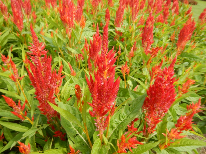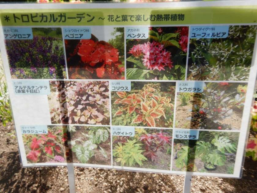 まだまだ暑いため、夏の観葉植物が活躍中。半円形花壇にいろいろ植えてありますので、お近くで見比べてみてください。
