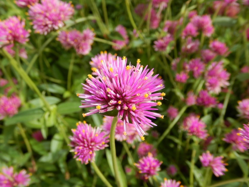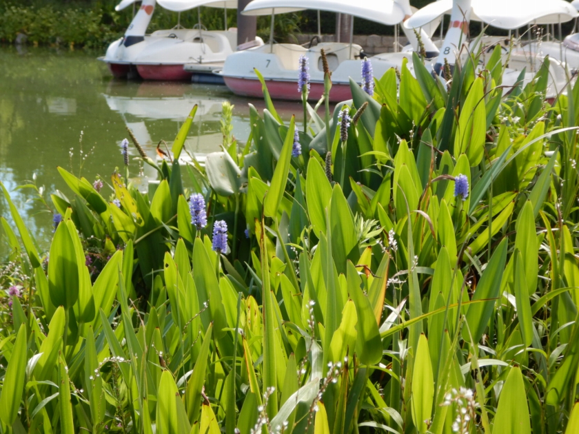 中海周りには水辺が好きな植物たちが植わっています。青色がポンテデリア、茶色のアメリカンドッグ状のものがガマです。ピンク色のミソハギはそろそろ終わりのため割愛しました。