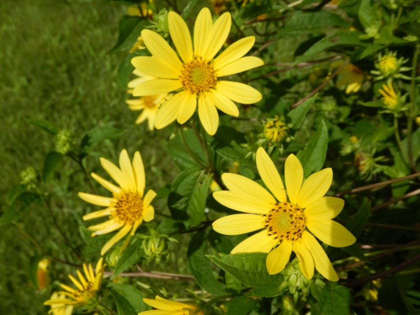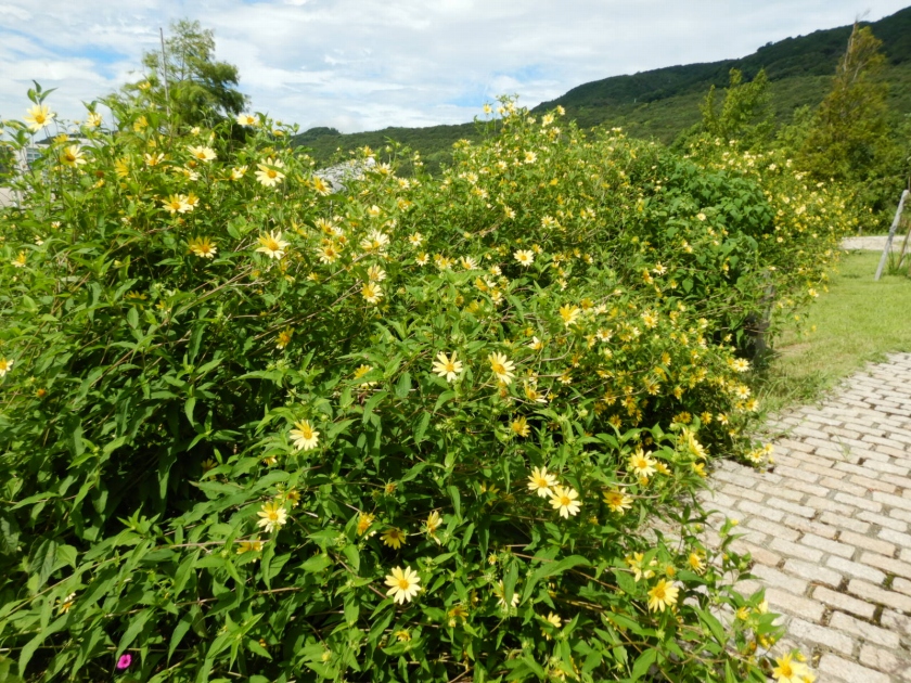 直径7㎝ほどのレモンイエローの花がたくさん咲き始めました。地味だけど一応ヒマワリの仲間です。