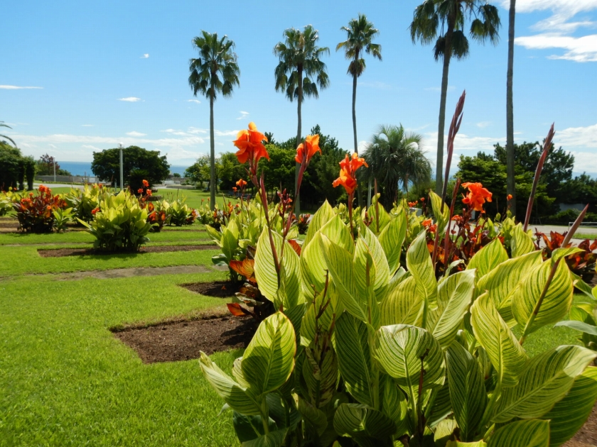 背の高いヤシの木の足元にパキッとしたオレンジ。まだまだ夏らしさを感じさせています。