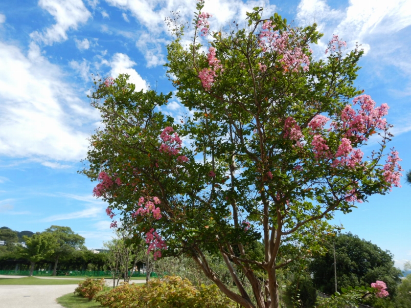 園内ではサルスベリ、シマサルスベリ、イッサイサルスベリがご覧いただけます。白、赤、濃桃、ピンクなどなど、ちょっとずつあります。(写真の場所は、一・二枚目は移ろいの庭周辺、三枚目は海見橋、四枚目は子供の森)