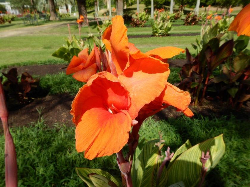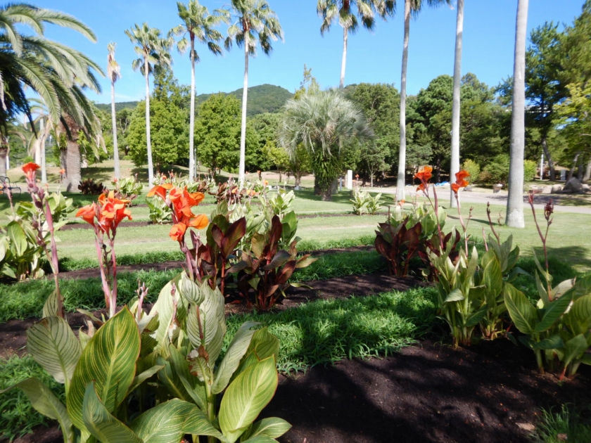 背の高いヤシの木がそびえるパームガーデン。夏っぽいヤシの足元で夏っぽいオレンジの花。夏です。