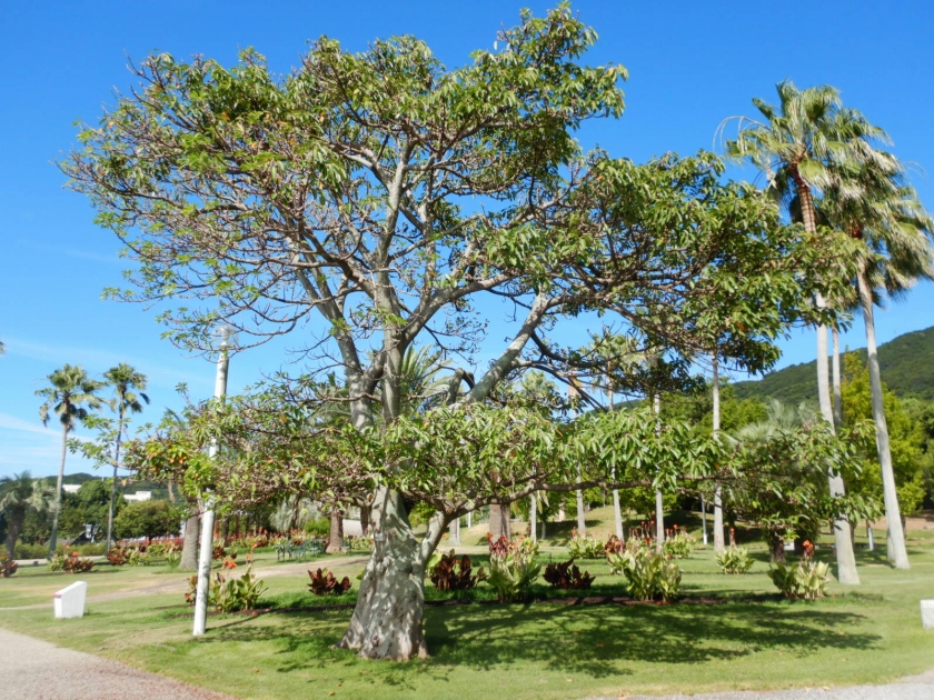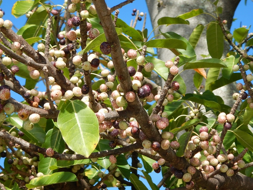 大きくそびえ立つアコウの木。枝や幹に1㎝くらいのブツブツツブツブの実がビッシリ。緑色から赤茶色に熟してきていて、木の下にボタボタ落ちてます。