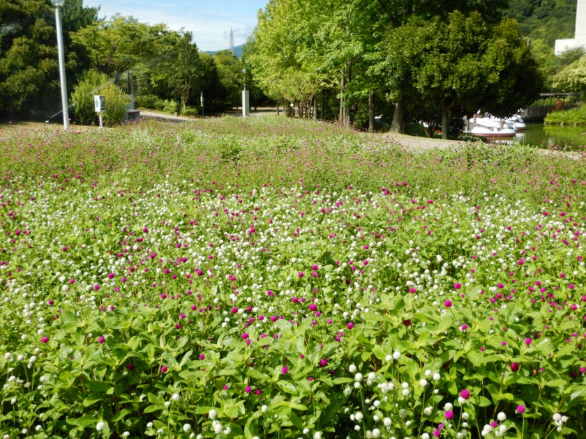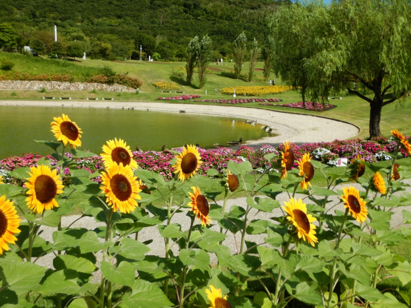赤・白・桃色の花が鮮やかに水辺を飾っています。ヒマワリとの相性バッチリ。