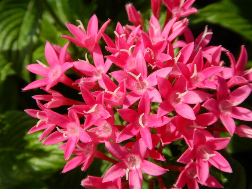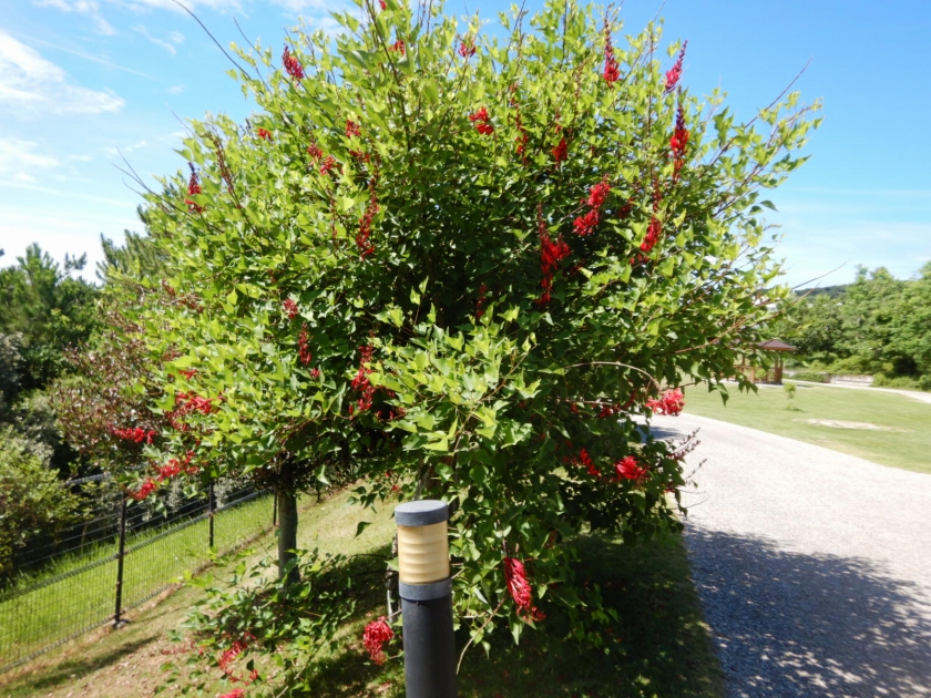 カンナ、ノウゼンカズラのオレンジ色、そしてこのサンゴシトウの赤色。海のテラス周辺は夏っぽい色満載。