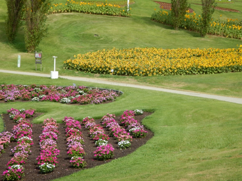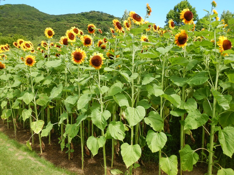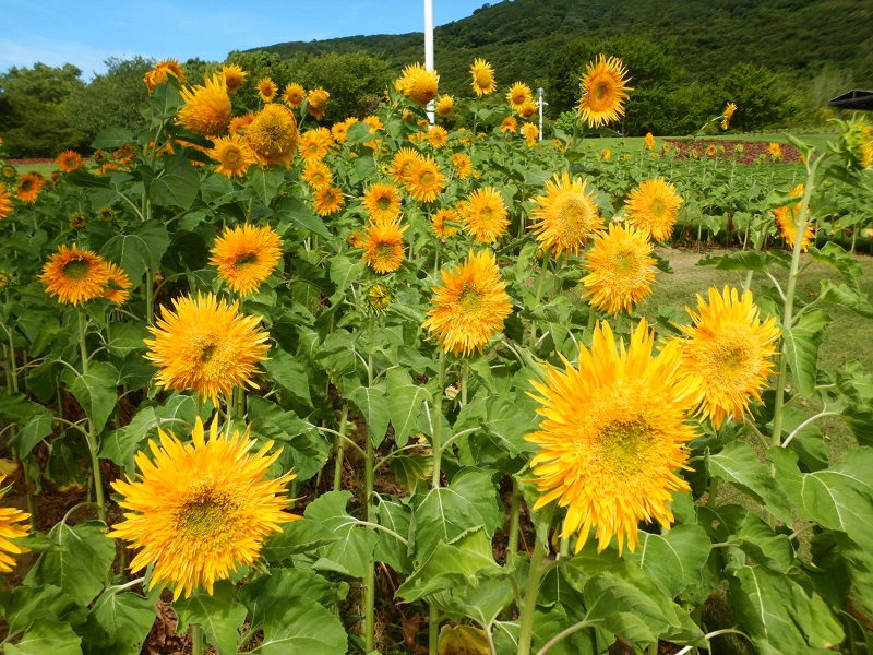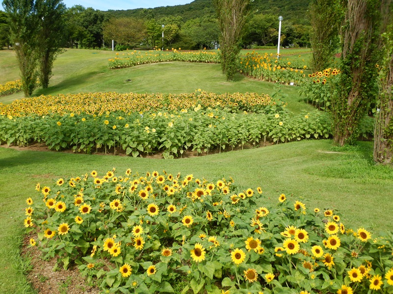 大地の虹北花壇とポプラの丘のヒマワリが見ごろです。全ての品種が咲いています。