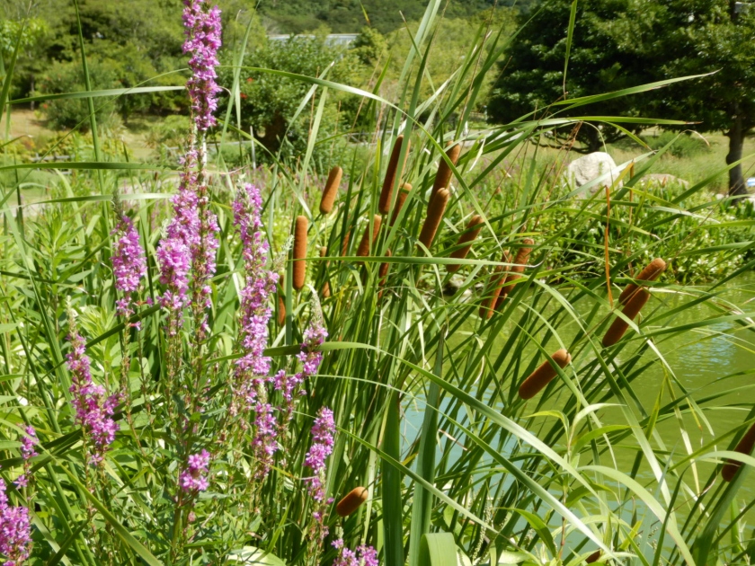 中海周りには水辺が好きな植物たちが植わっています。ピンク色のお花がミソハギ、青色がポンテデリア、茶色のアメリカンドッグ状のものがガマです。