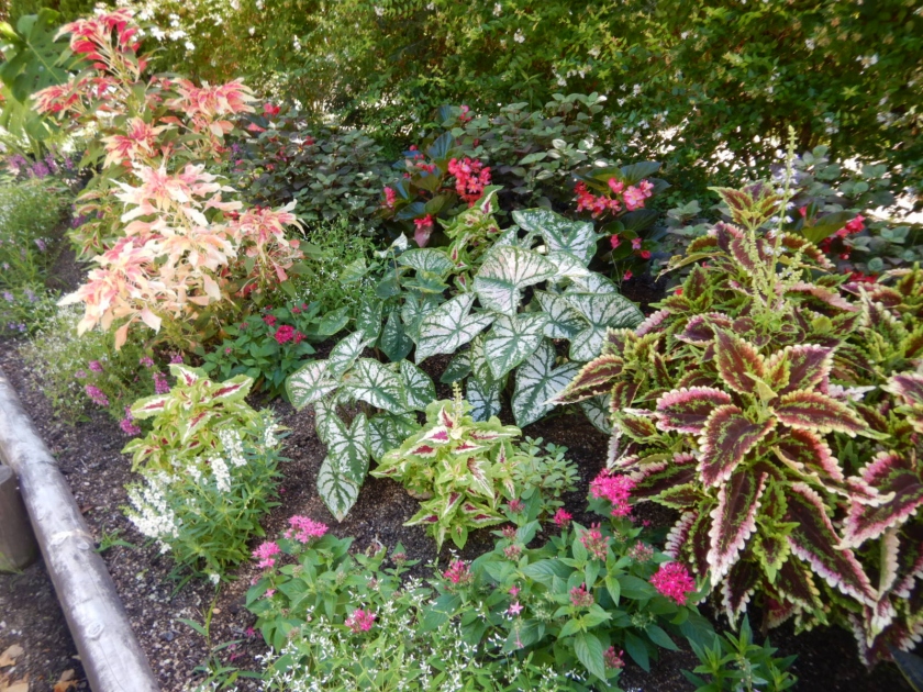 夏はカラフルな葉っぱを楽しむ植物が出回ります。半円形花壇にいろいろ植えましたので、お近くで見比べてみてください。