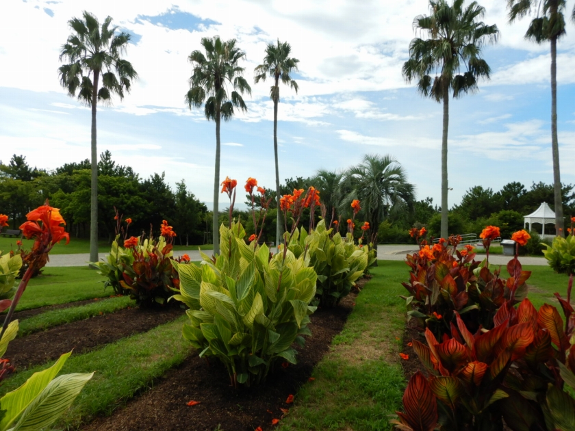 背の高いヤシの木の足元にパキッとしたオレンジ。まだまだ夏らしさを感じさせています。