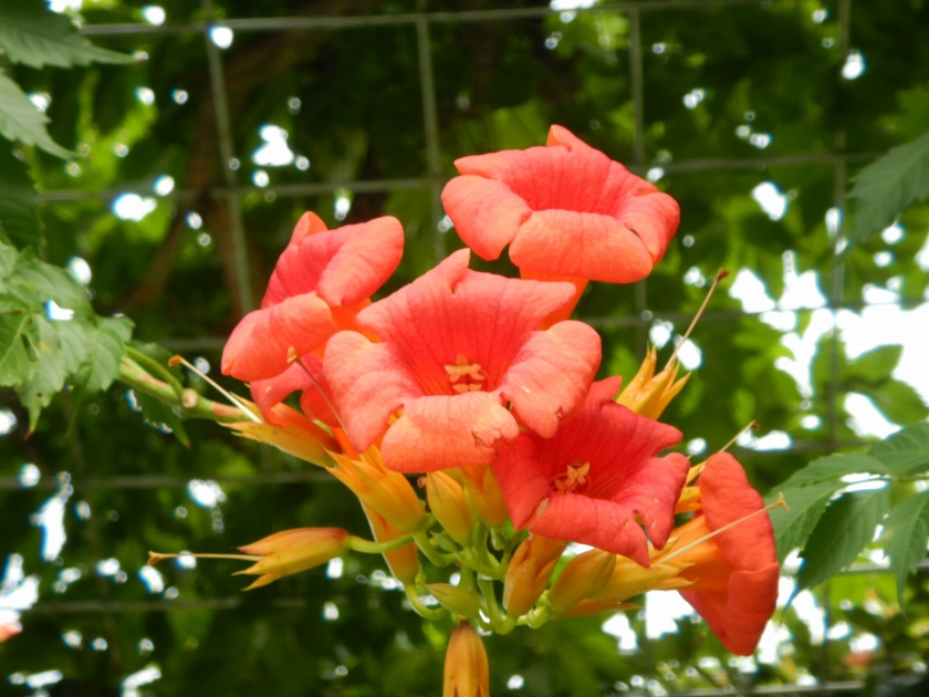 海のテラスのアーチや芝生広場周辺のフェンスに絡みついているノウゼンカズラ。ひとつひとつの花の寿命が短いため、日によって数輪しか咲いていない日も。