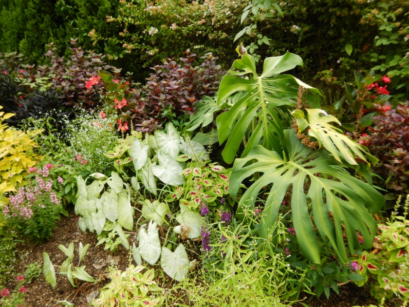 まだまだ暑いため、夏の観葉植物が活躍中。半円形花壇にいろいろ植えてありますので、お近くで見比べてみてください。