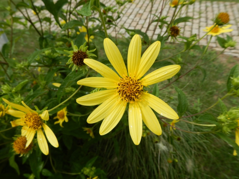 直径7㎝ほどのレモンイエローの花がたくさん咲いています。地味だけど一応ヒマワリの仲間です。